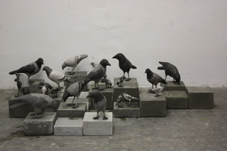 Maria and Natalia Petschatnikov place their art personnel in this organised business world. The room is populated by dogs and birds. The dogs were photographed on the streets of Berlin, then painted and modelled into 1:1 scale sculptures. The life-size birds represent the three most common species found in cities, namely crows, pigeons and sparrows. To avoid any misunderstanding, the artists are not concerned here with a love of animals or rural idylls, but with the urban contexts of their works. The invisible animal owner at the end of the leash is important for understanding the works.
